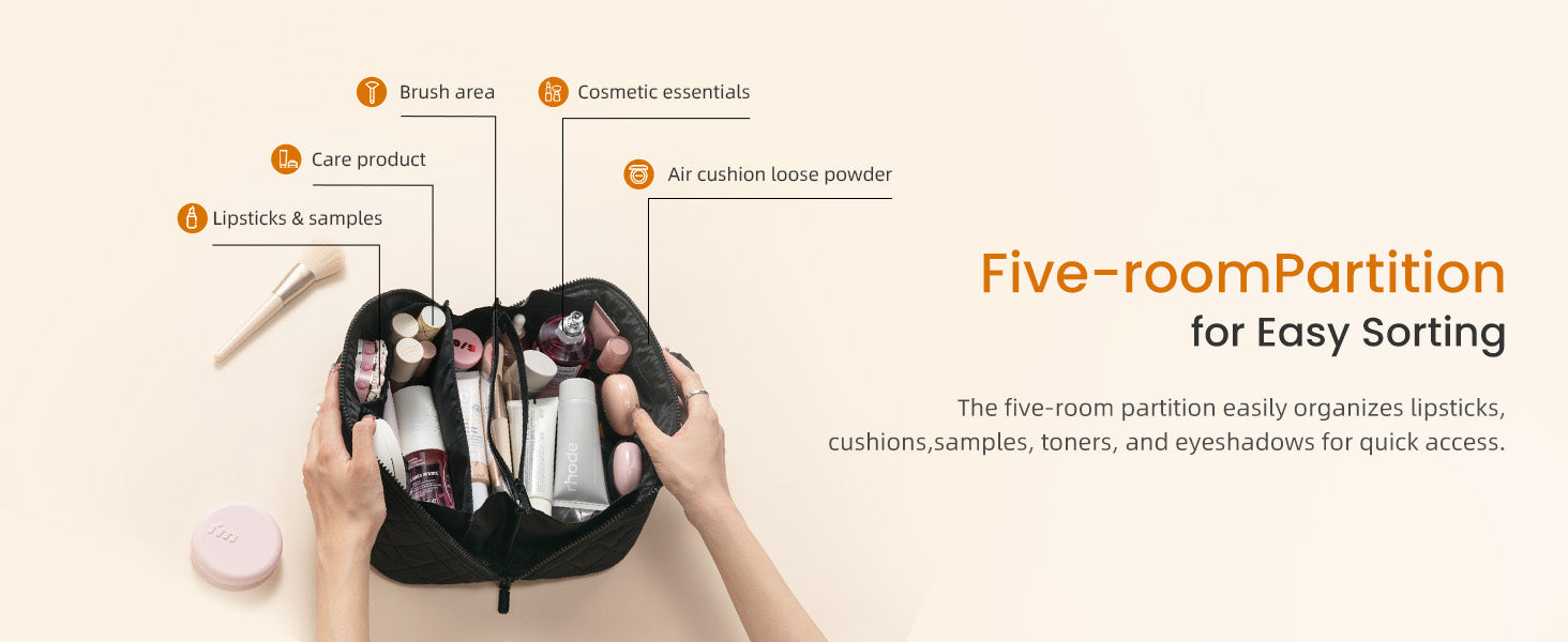 Fluffy Machine-Washable Fabric: The lining is made of soft, fluffy, pressure-resistant, and durable fabric that protects fragile items. It's machine washable for easy cleaning, making it a long-lasting companion for your travel makeup bag.